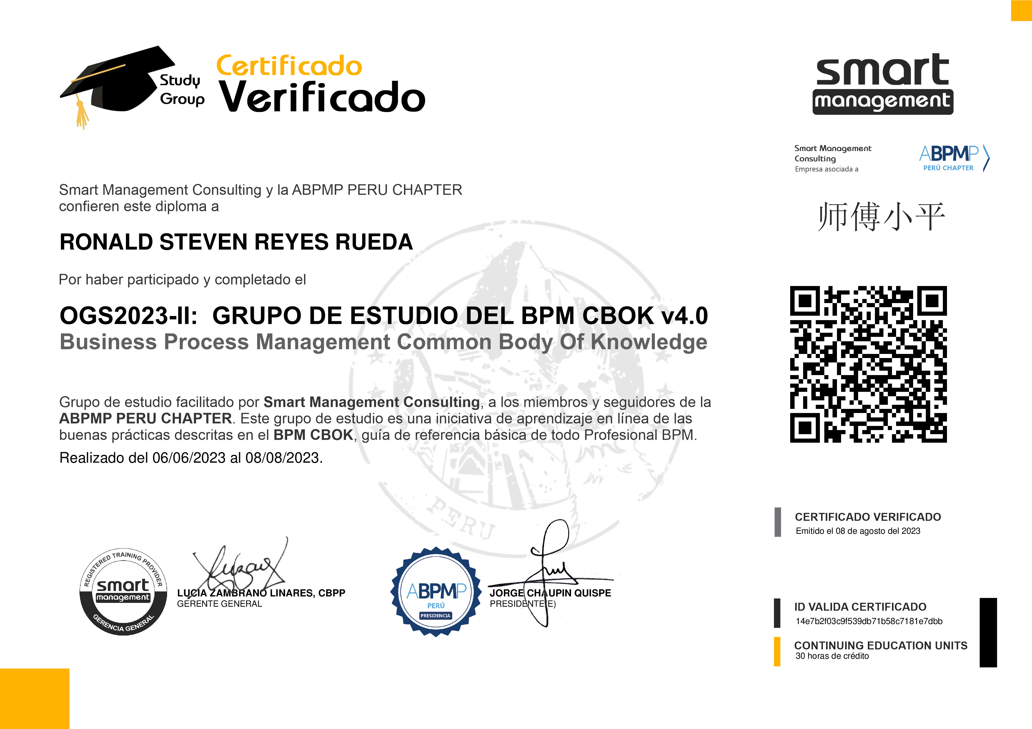 Smart Management Consulting es una consultora asociada a la ABPMP PERU CHAPTER, siendo uno de los brazos ejecutores de la educación continúa de sus miembros y profesionales BPM en general, con el desarrollo de grupos de estudio, cursos, talleres y programas alineados al BPM CBOK.