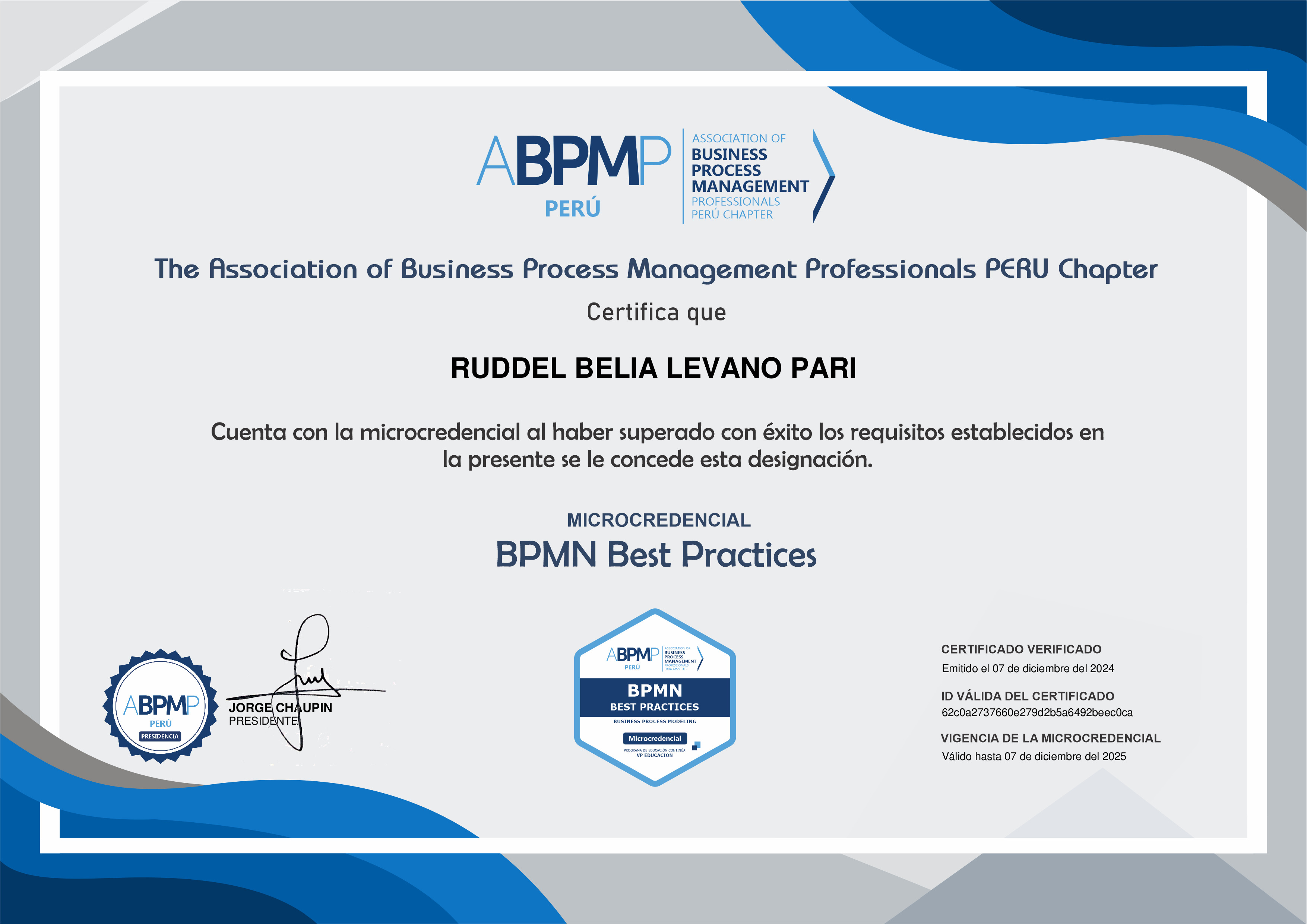 Obtuviste tu microcredencial a nombre de ABPMP PERU CHAPTER reconocemos tu competencia y ansías de conocimiento. Comparte este reconocimiento con tus colegas, amigos y familiares; y hazle saber al mundo lo que aprendiste sobre BPMN Best Practices.