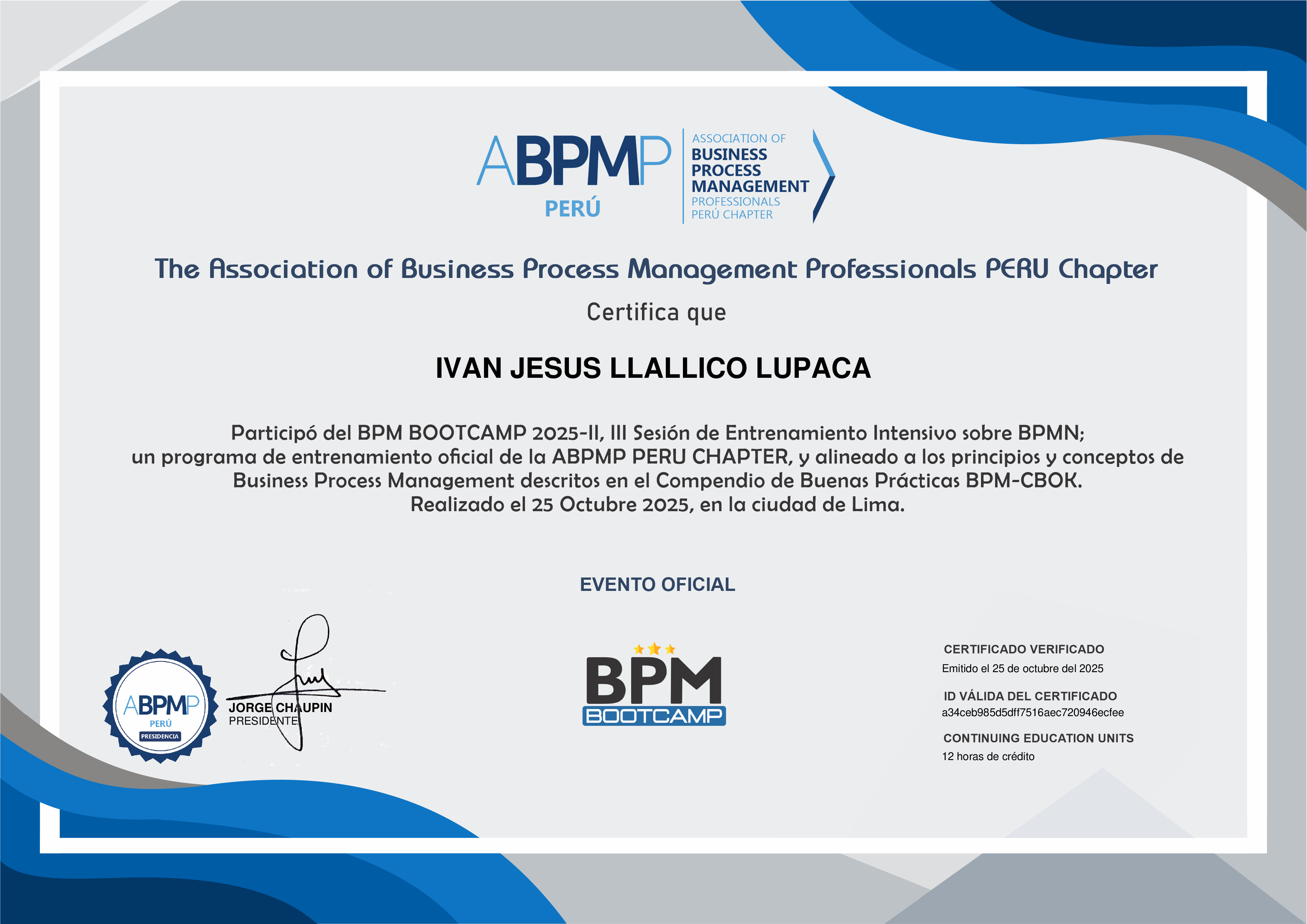 Por participar del Evento; a nombre de ABPMP PERU CHAPTER agradecemos tu asistencia y apoyo. Comparte este reconocimiento con tus colegas, amigos y familiares; y hazle saber al mundo lo que participaste en el evento: BPM Bootcamp 2025-II.