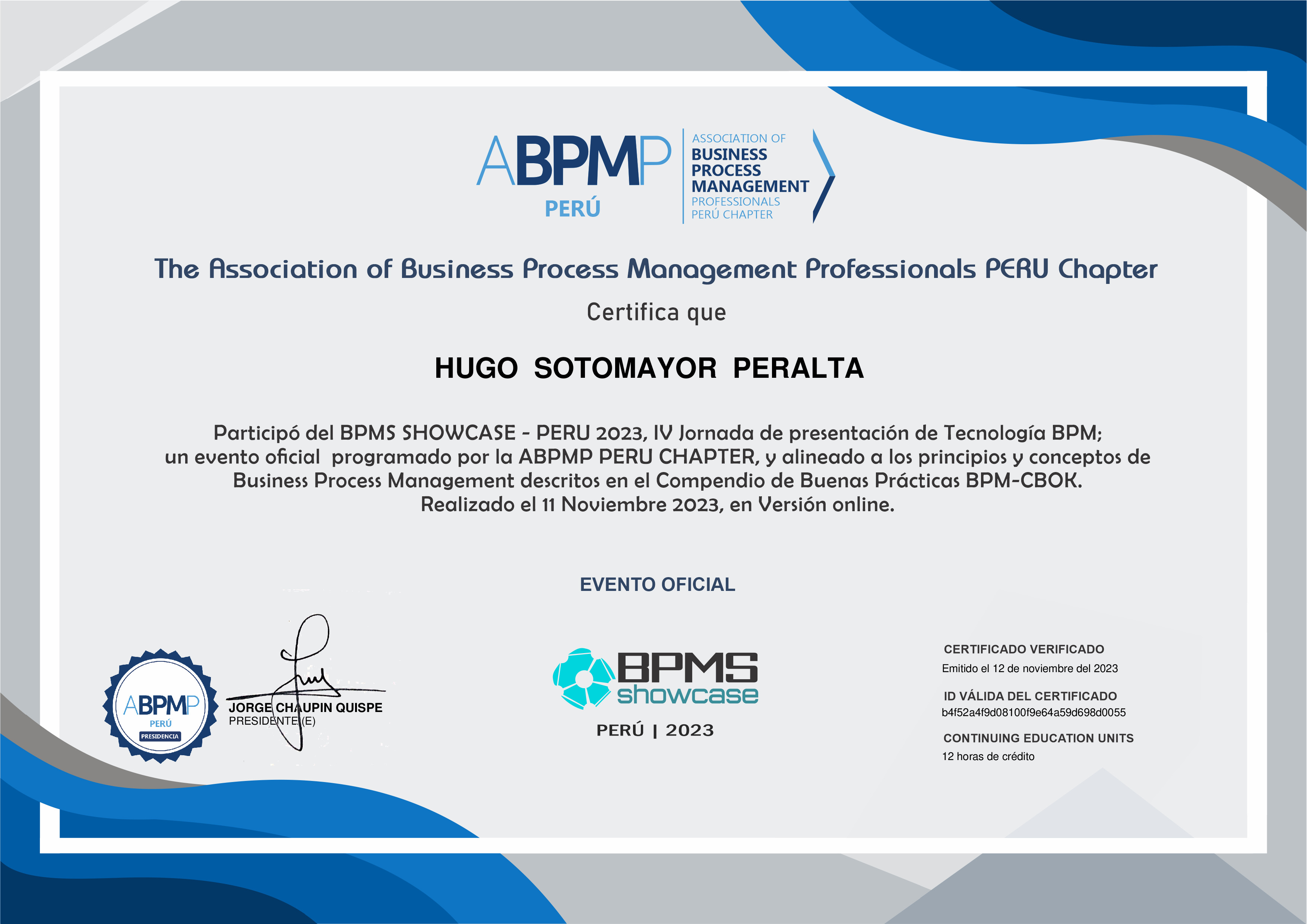 Por participar del Evento; a nombre de ABPMP PERU CHAPTER agradecemos tu asistencia y apoyo. Comparte este reconocimiento con tus colegas, amigos y familiares; y hazle saber al mundo lo que participaste en el evento: BPMS SHOWCASE - PERU 2023.